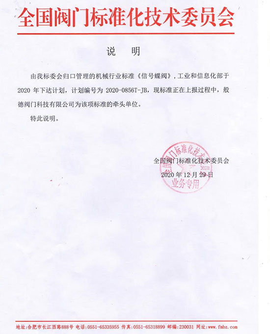 今天是2020年的最后一天,般德閥門(mén)再獲殊榮,成為機(jī)械行業(yè)標(biāo)準(zhǔn)《信號(hào)蝶閥》的牽頭單位,國(guó)家標(biāo)準(zhǔn)《工業(yè)閥門(mén)的逸散性試驗(yàn)》、《通用閥門(mén) 不銹鋼鑄件技術(shù)條件》、《鐵制和銅制螺紋連接閥門(mén)》、《工業(yè)閥門(mén) 壓力試驗(yàn)》四項(xiàng)標(biāo)準(zhǔn)的起草單位之一。