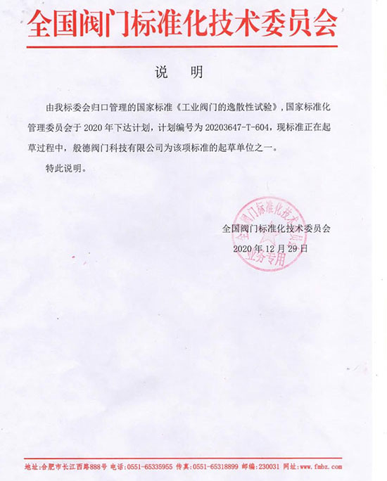圖|般德閥門(mén)為國(guó)家標(biāo)準(zhǔn)《工業(yè)閥門(mén)的逸散性試驗(yàn)》起草單位之一