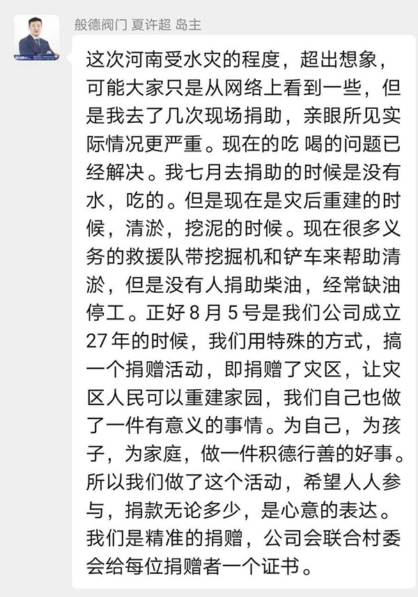 般德閥門27歲生日,我們決定一起做一件有意義的事!般德閥門總經理夏許超帶頭發起“抗洪救災愛心捐款”活動,捐款全部購買老鄉們急需的物資,助力災后重建。