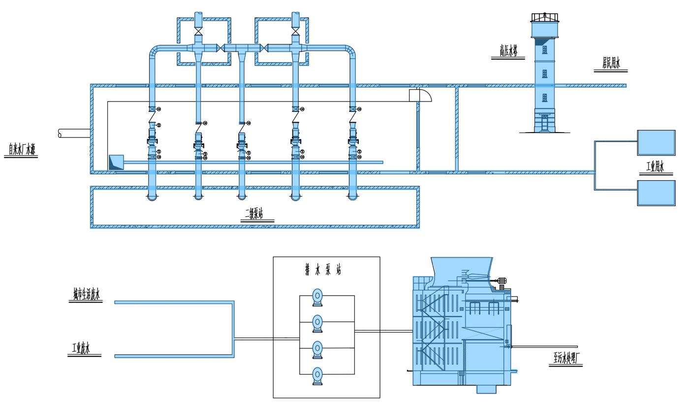將從自來水廠處理過的清水,輸引配送到用水區,供用戶使用,主要由二級泵站、輸水管道、配水管網、水塔等幾部分構成。